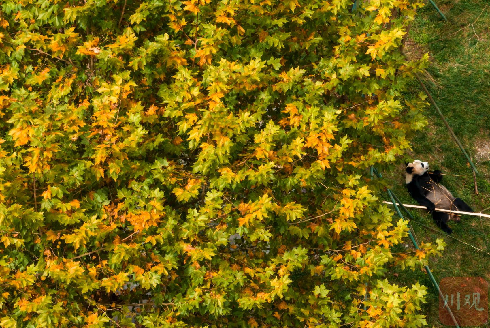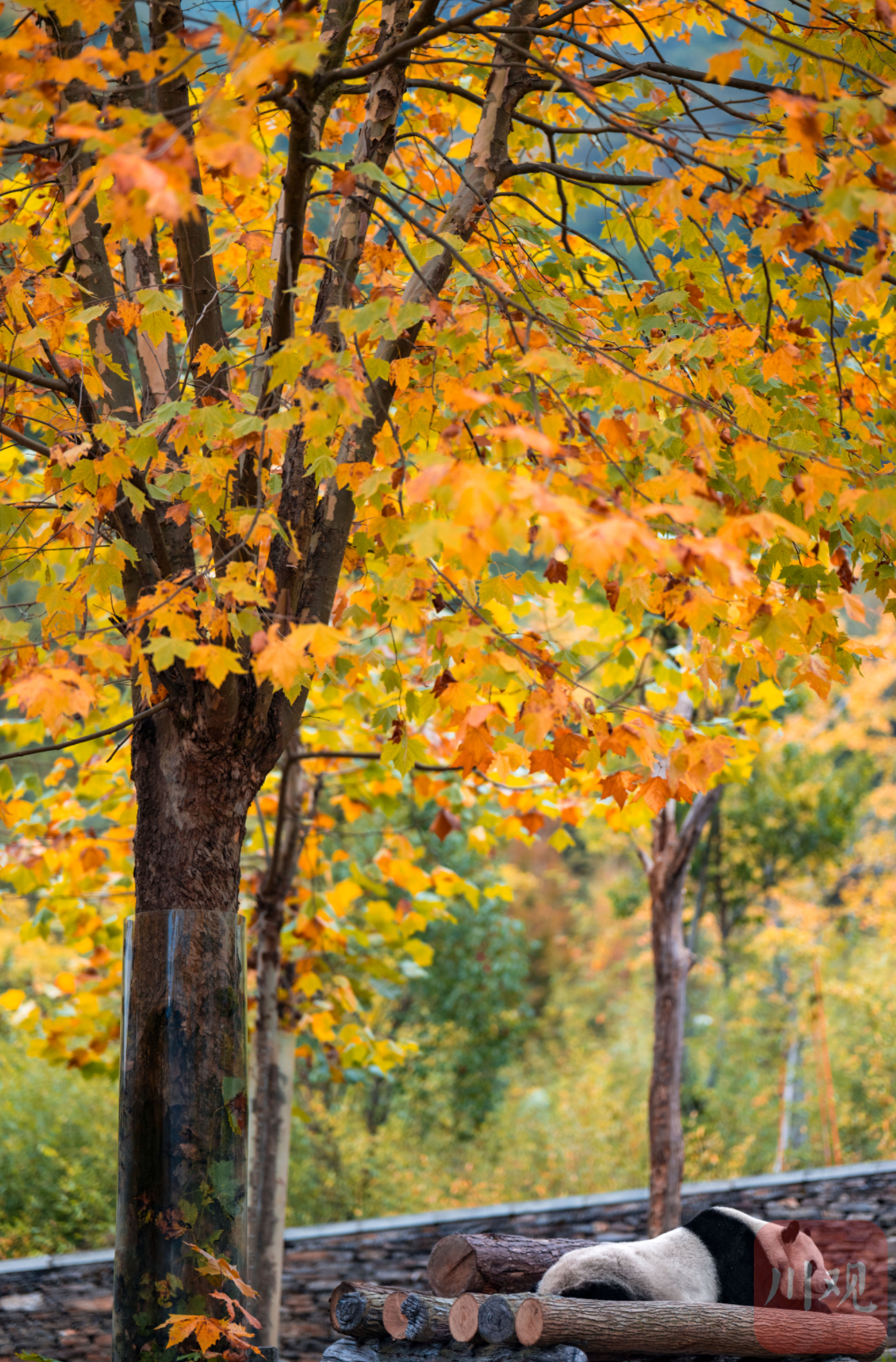 10月29日,阿坝州汶川县的中国大熊猫保护研究中心卧龙神树坪基地内,大熊猫在基地工作人员的照顾下享受秋日好时光。进入深秋,基地内树木的树叶变黄,与四周高山的彩林构成了秋日美景。大熊猫们爬上树梢,惬意地欣赏起迷人的秋,来告别秋天,迎接冬天的到来。