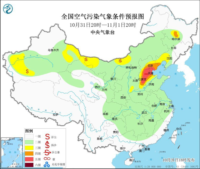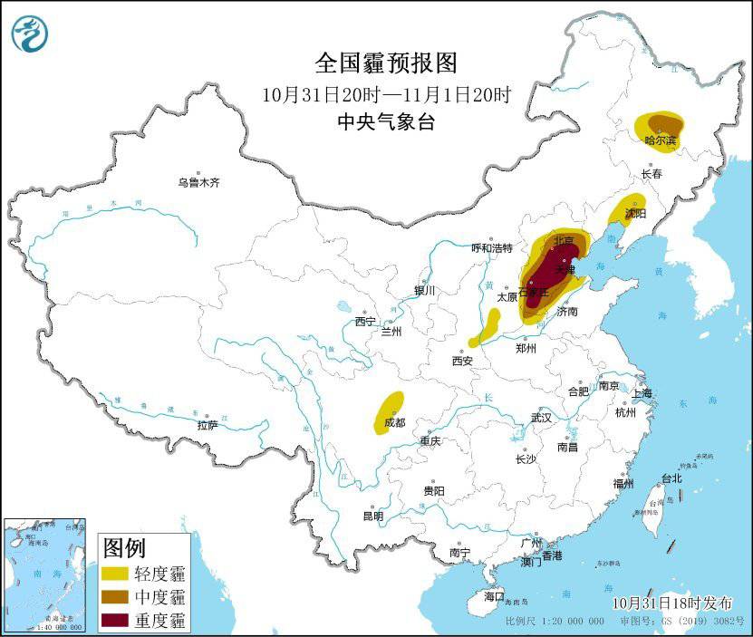 预计10月31日夜间至11月1日,北京东部、河北中南部、天津大部、辽宁东部、四川盆地西部和东北部等地的部分地区有大雾,其中北京东南部、天津西部、河北中南部等地的部分地区有能见度低于200米的强浓雾。因此,中央气象台10月31日18时发布大雾黄色预警。