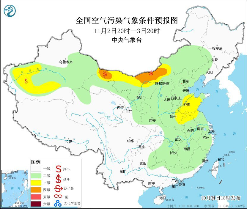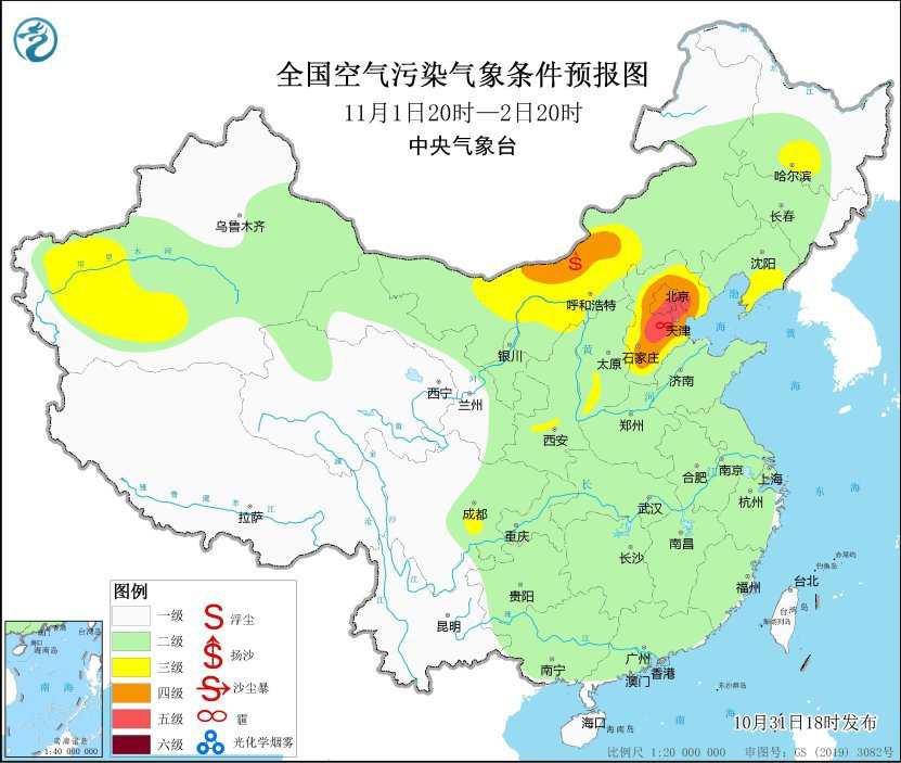 此外,11月1日至11月2日,京津冀地区等地大气扩散条件较差,有轻到中度霾天气,其中华北中部等地有重度霾。11月2日下午起,受冷空气影响,上述地区大气扩散条件逐渐转好,霾天气减弱消散。11月1日至2日,内蒙中西部、甘肃西部、陕西北部等地的部分地区有扬沙或浮尘天气。