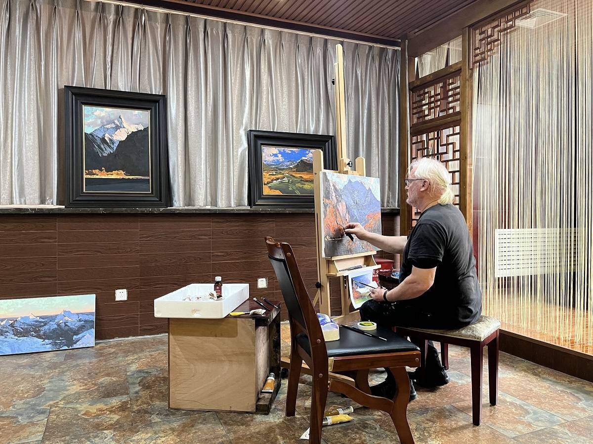 10月5日返回成都后,画家们一边调整完善作品,一边各自构思创作大幅油画。“画面题材内容,都来自我们在亚丁景区亲眼所见的风景,雪山、草地、高山湖泊。”亚历山大说,大家被艺术热情驱动,回成都不到两周就完成了创作。