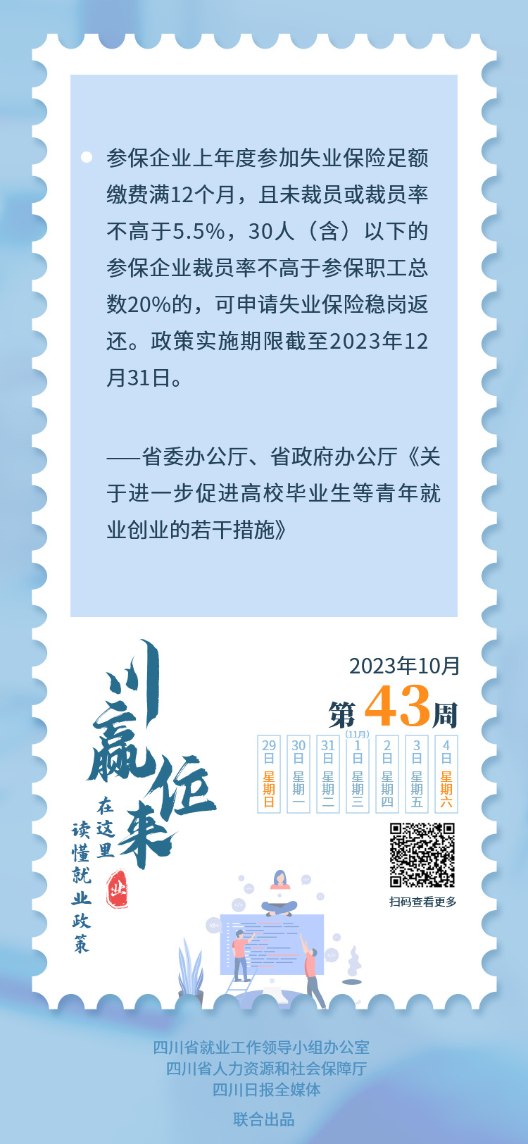 朋友们大家好,时光匆匆,转眼2023年就只余下不到两个月的时间啦。本期的“川赢位来·就业政策周历”温馨提醒大家,2023年失业保险稳岗返还政策申报截止时间为今年12月31日,符合条件的企业可千万不要忘记申报哦。