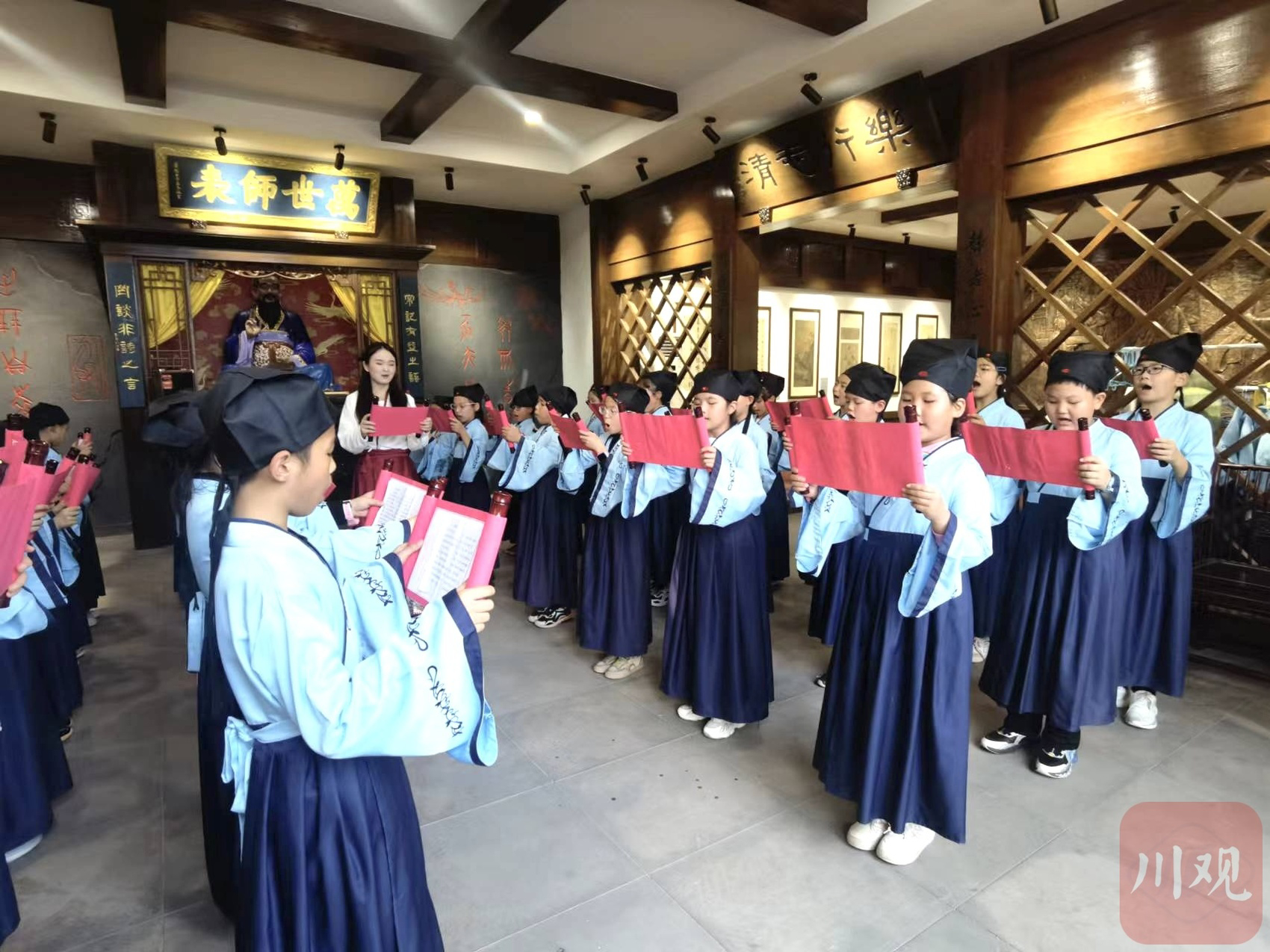 在渠县文峰书院,身着汉服的孩子们整齐诵读着《文明中国》。赵青 摄