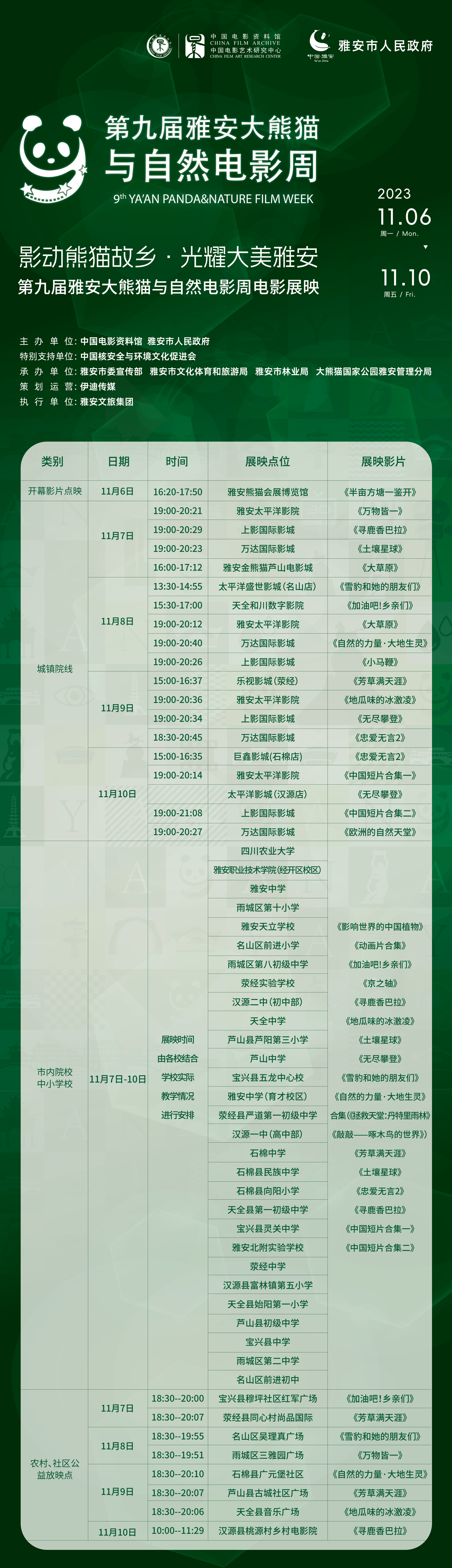 11月6日,第九届雅安大熊猫与自然电影周在雅安开幕。本次电影周由中国电影资料馆和雅安市政府联合主办,以“影动熊猫故乡·光耀大美雅安”为主题,从国内外生态影片里看人与自然和谐共生之美,用生态光影守护生命。