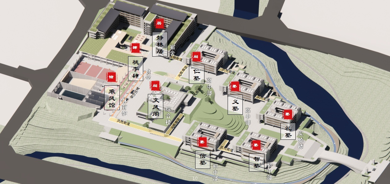 成都市石室中学云龙校区位于青岛路和锦江西19路交叉口东南象限,净用地约133亩,计划修建72个班,其中初中36个班,高中36个班。采用环山抱水组团式布局,按照“顺应地形、善用退台、紧凑高效”的原则,围绕山体景观布置建筑,形成初中教学区、高中教学区、综合楼、宿舍区、运动区等部分。