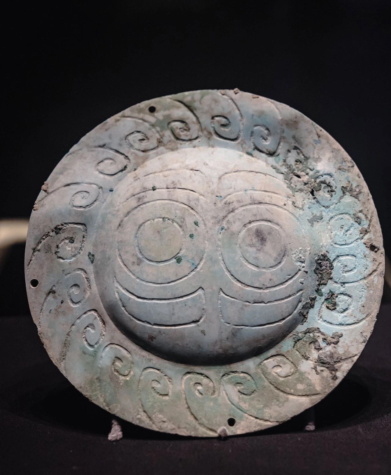 接下来的这块青铜圆形牌饰,也十分引人深思。第一眼看上去,它的造型与纹路,好似一只昂首看天的猫头鹰。牌饰周身有四个孔,或许具备一定功能性,而把它叫作牌饰,就是因为它可能是古蜀人的装饰用品。仔细察看,你就会发现,三星堆文物中一些人物身上的纹饰与牌饰上的很类似。比如青铜小立人衣服上腰间的图案、金沙遗址出土的人面鱼鸟箭纹金王冠带上的部分图案等等。