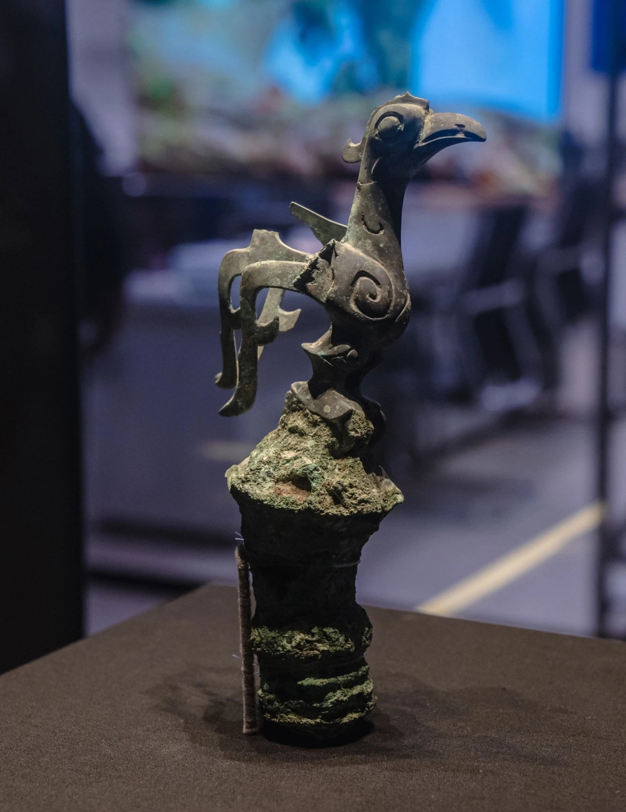 据介绍,在国庆节期间,三星堆修复馆就曾上新一只铜鸟,而这一次,它又被“新品”替换了。只见这只上新的青铜鸟翱翔姿势已经“拉满”,只是徒有腾空的动作,断掉的翅膀已不堪飞行之用。铜鸟足下还有其他部件,暂不知完整形态,好似一只“折翼天使”。