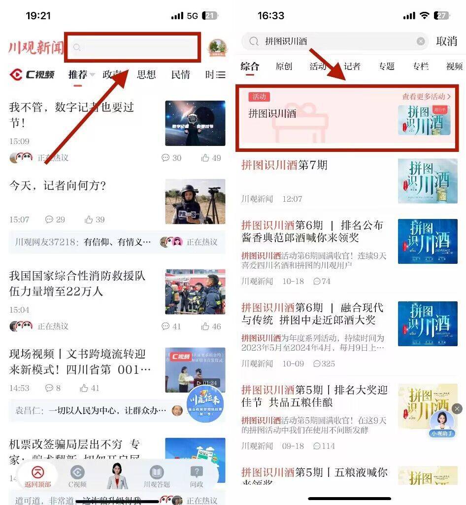 3、在川观新闻首页顶部搜索框输入“拼图识川酒”,点击活动链接即可参与。
