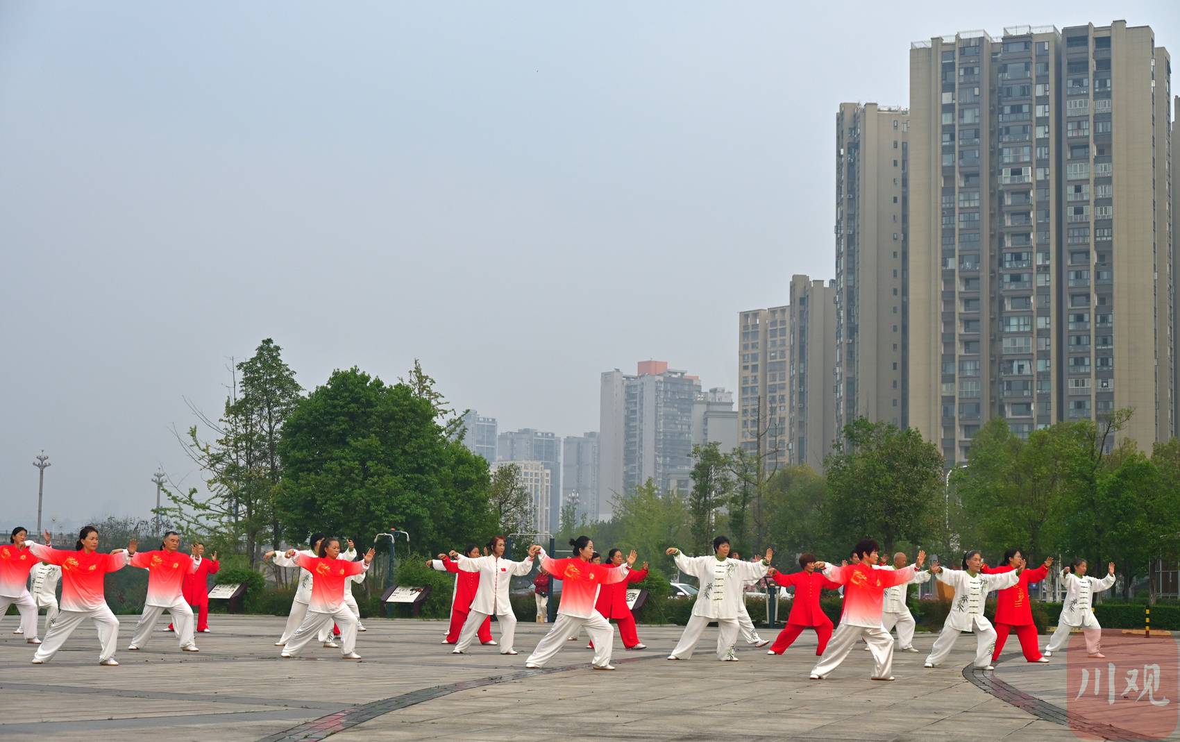 市民在中医文化公园内打太极拳。