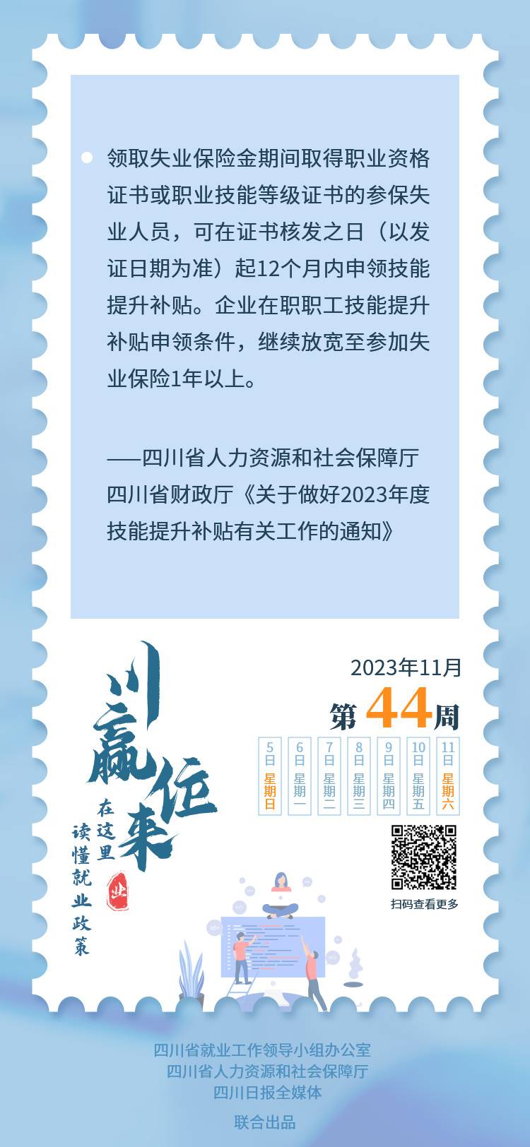 为了深入实施就业优先战略,多措并举稳定和扩大就业岗位,全力促发展惠民生,根据四川省人力资源和社会保障厅、四川省财政厅有关2023年度技能提升补贴通知精神,领取失业保险金期间取得职业资格证书或职业技能等级证书的参保失业人员,可在证书核发之日(以发证日期为准)起12个月内申领技能提升补贴。企业在职职工技能提升补贴申领条件,继续放宽至参加失业保险1年以上。