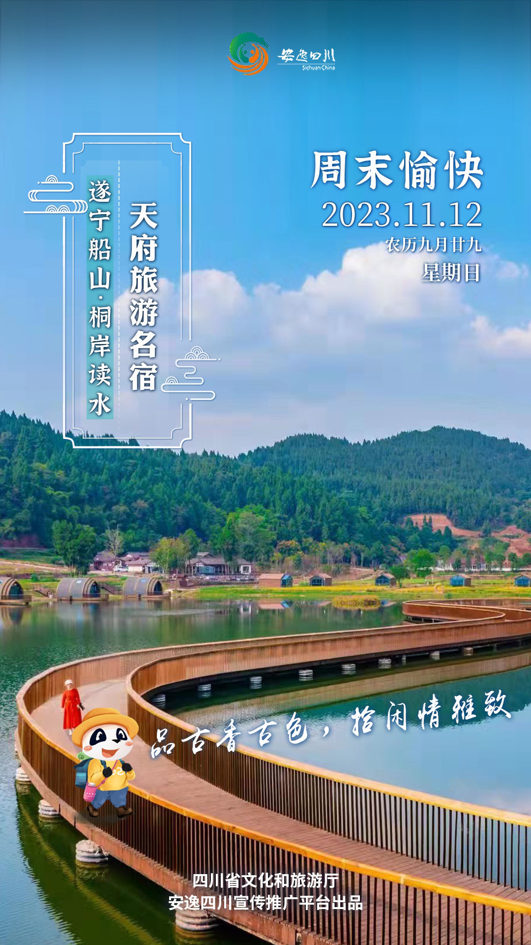 11月12日,星期日,周末愉快。今日安逸四川日历海报“第三批天府旅游名宿”之旅走进遂宁市船山区桐岸读水。
