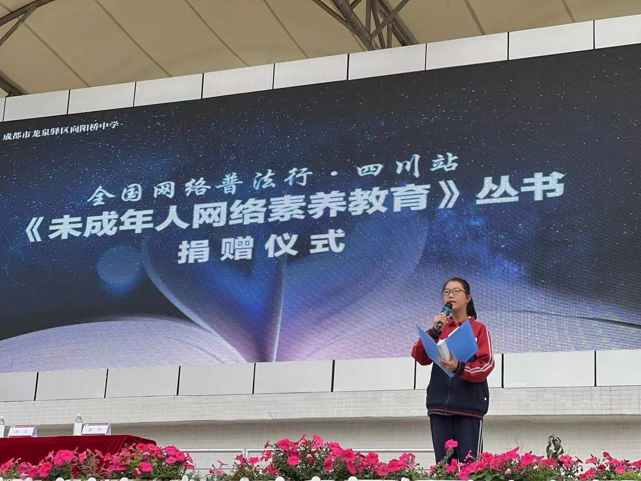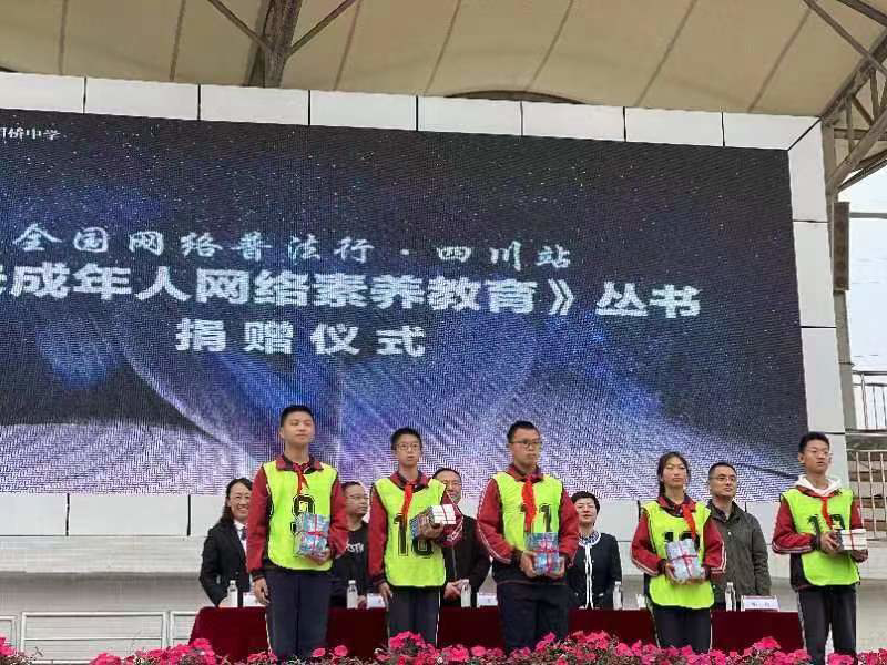 11月10日,“全国网络普法行·四川站”《未成年人网络素养教育》丛书捐赠仪式在成都龙泉驿向阳桥中学举行。出自四川省未成年人网络保护促进会的1000套丛书送到了孩子们手里。