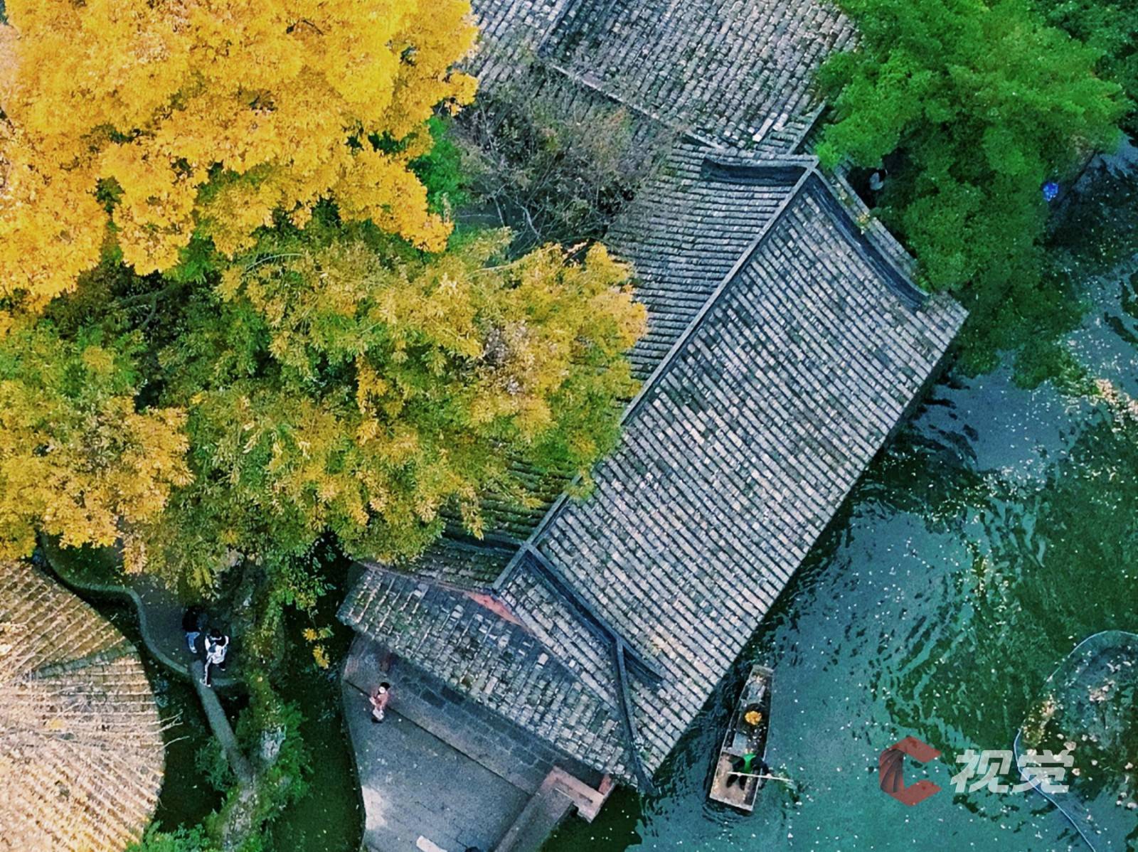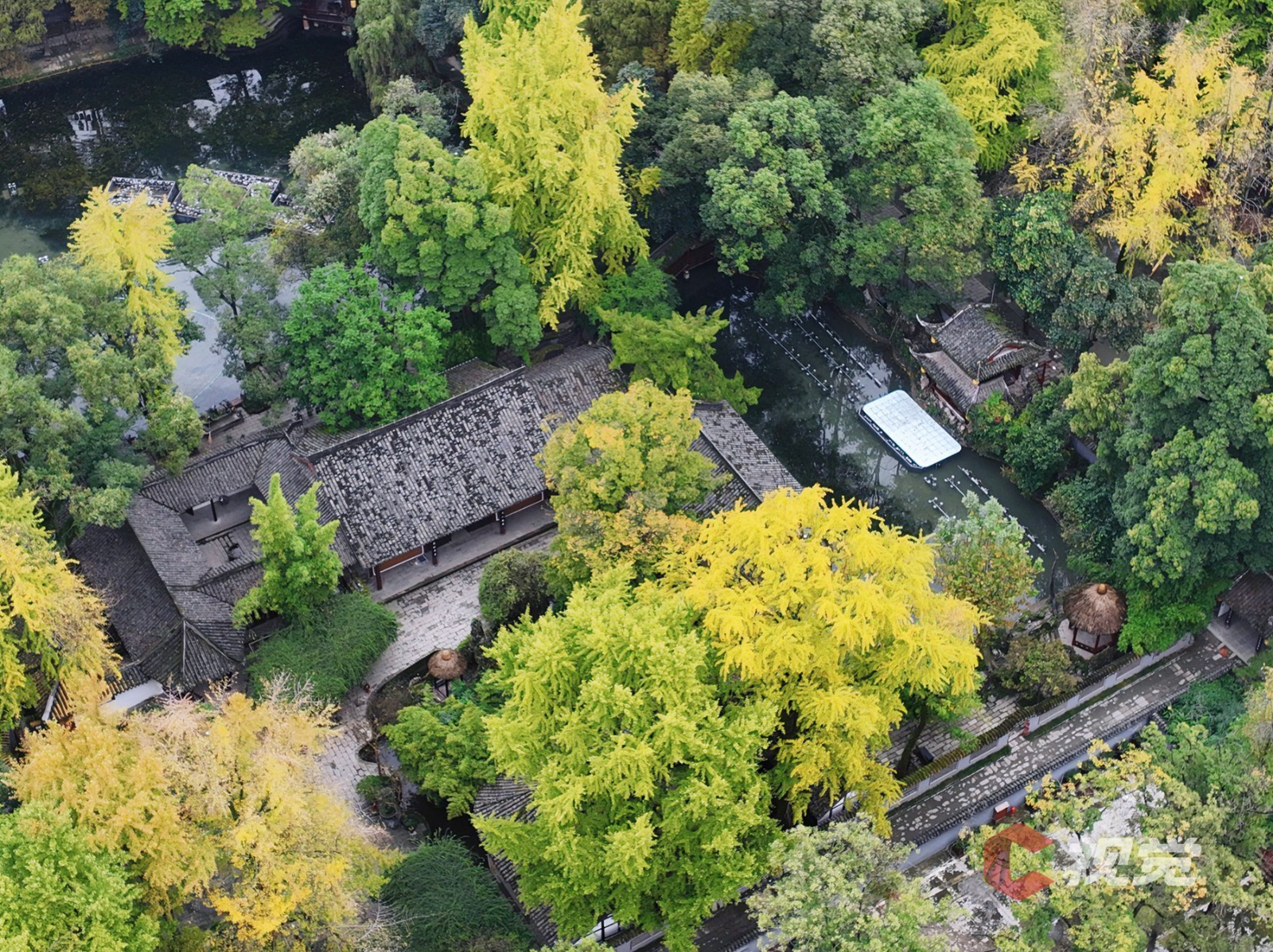 叶落知秋,霜落知寒,但属于银杏的时节才刚刚开始。11月13日,C视觉摄影师朱志宏在崇州罨画池、黑石河畔拍摄到银杏林,已是金色初显。满眼金黄扑面而来,抬头眺望,满树璀璨,挂在枝头的金黄叶子,蕴藏了初冬所有的热情,映衬着千年罨画池的古色古香,成为无可替代的风景。