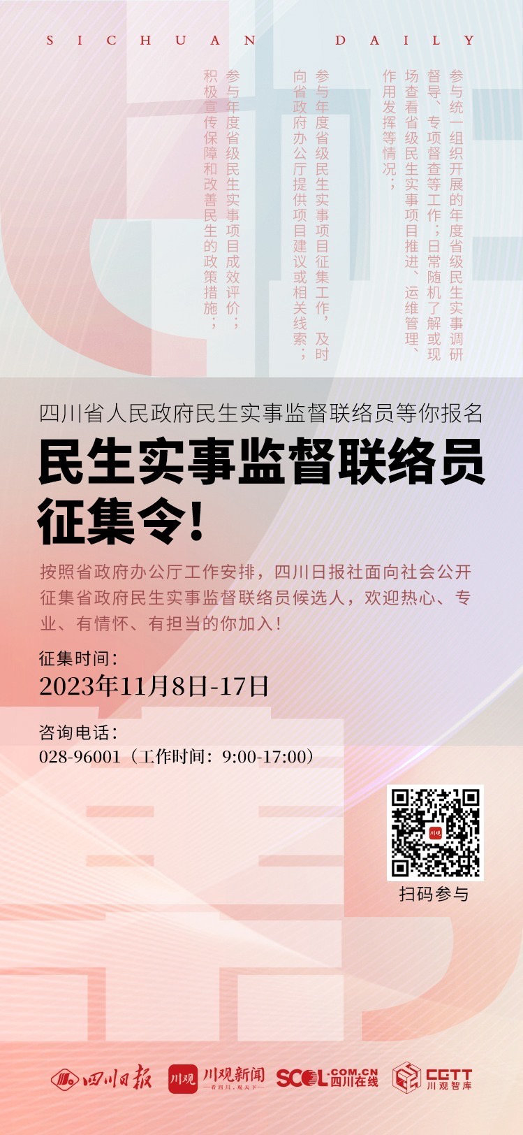 根据省政府办公厅工作安排,11月8日起,四川日报社通过川观新闻客户端向社会公开征集省政府民生实事监督联络员候选人,邀请热心、专业、有情怀、有担当的社会各界人士参与,为四川民生实事落地落实助力。