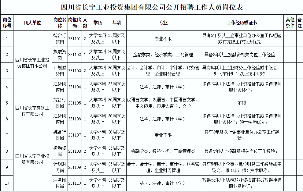 本次招聘名额为14名,具体招聘名额和岗位条件等情况请详见《四川省长宁工业投资集团有限公司公开招聘工作人员岗位表》(以下简称《岗位表》。