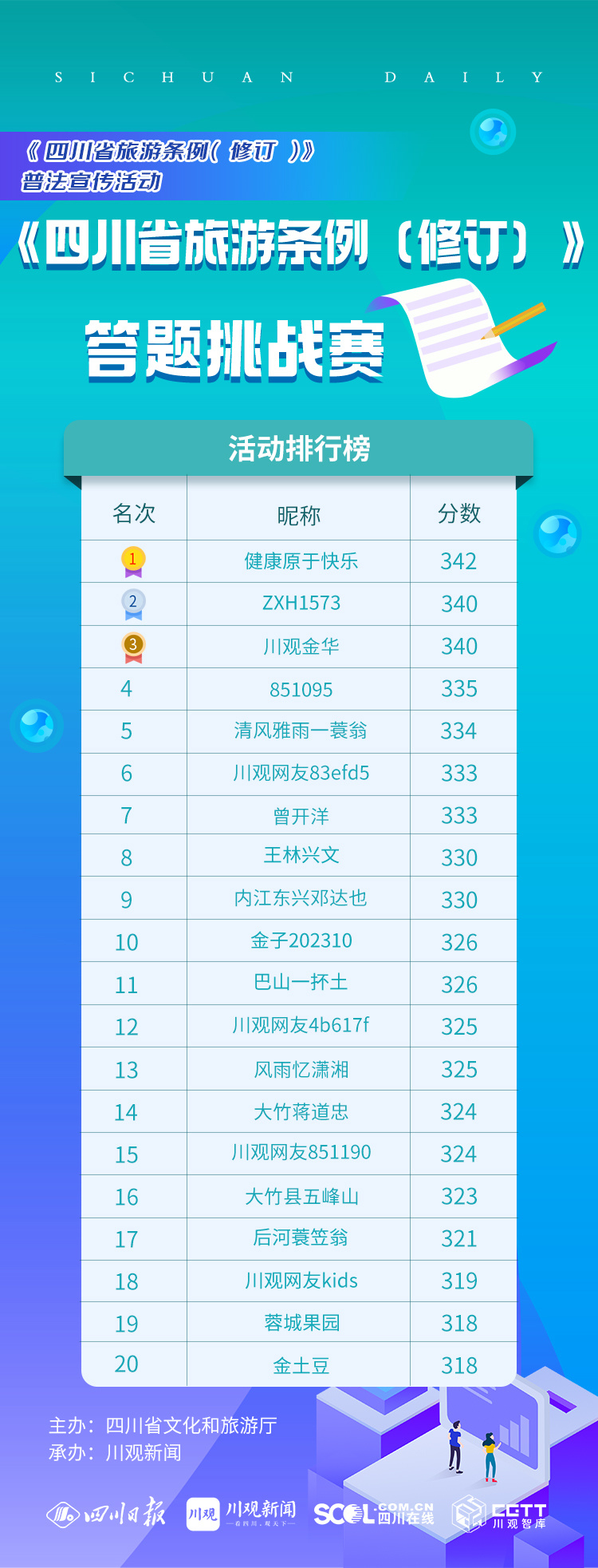 11月14日,由四川省文化和旅游厅联合川观新闻推出的《四川省旅游条例(修订)》答题挑战赛圆满收官,超50万人次网友参加此次活动。题目紧扣修订条例,用生动有趣、贴近生活的方式普及相关法规知识,以赛促学,达到了普法效果。