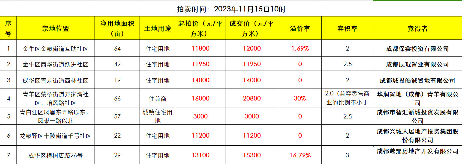 从今天土地拍卖结果来看,出让的7宗地全部成交,其中4宗地底价成交,3宗地溢价成交。溢价率最高的是青羊区蔡桥街道66亩住兼商地块,起拍价16000元/㎡,最终成交楼面地价达20800元/㎡,溢价率30%,被华润置地拿下,成为本次土地拍卖会最受关注的地块。