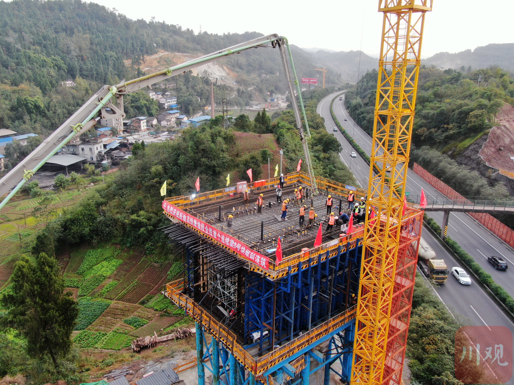 11月17日下午,位于达州高新区的槟郎特大桥施工现场,随着最后一立方米混凝土泵送入模,西渝高铁康渝段首个连续梁0号块浇筑完成,全线桥梁上部结构施工拉开序幕。