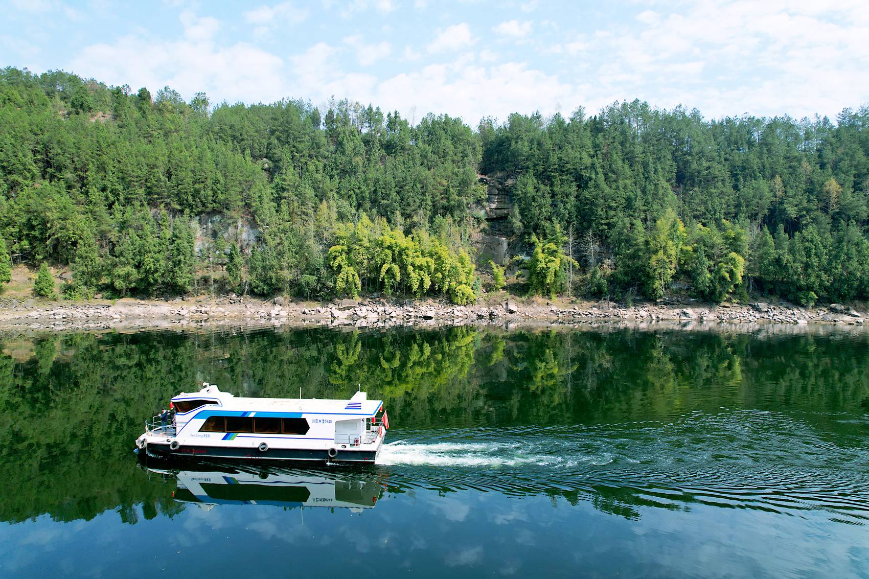 化成水库上航行的新能源客渡船。交通运输厅供图