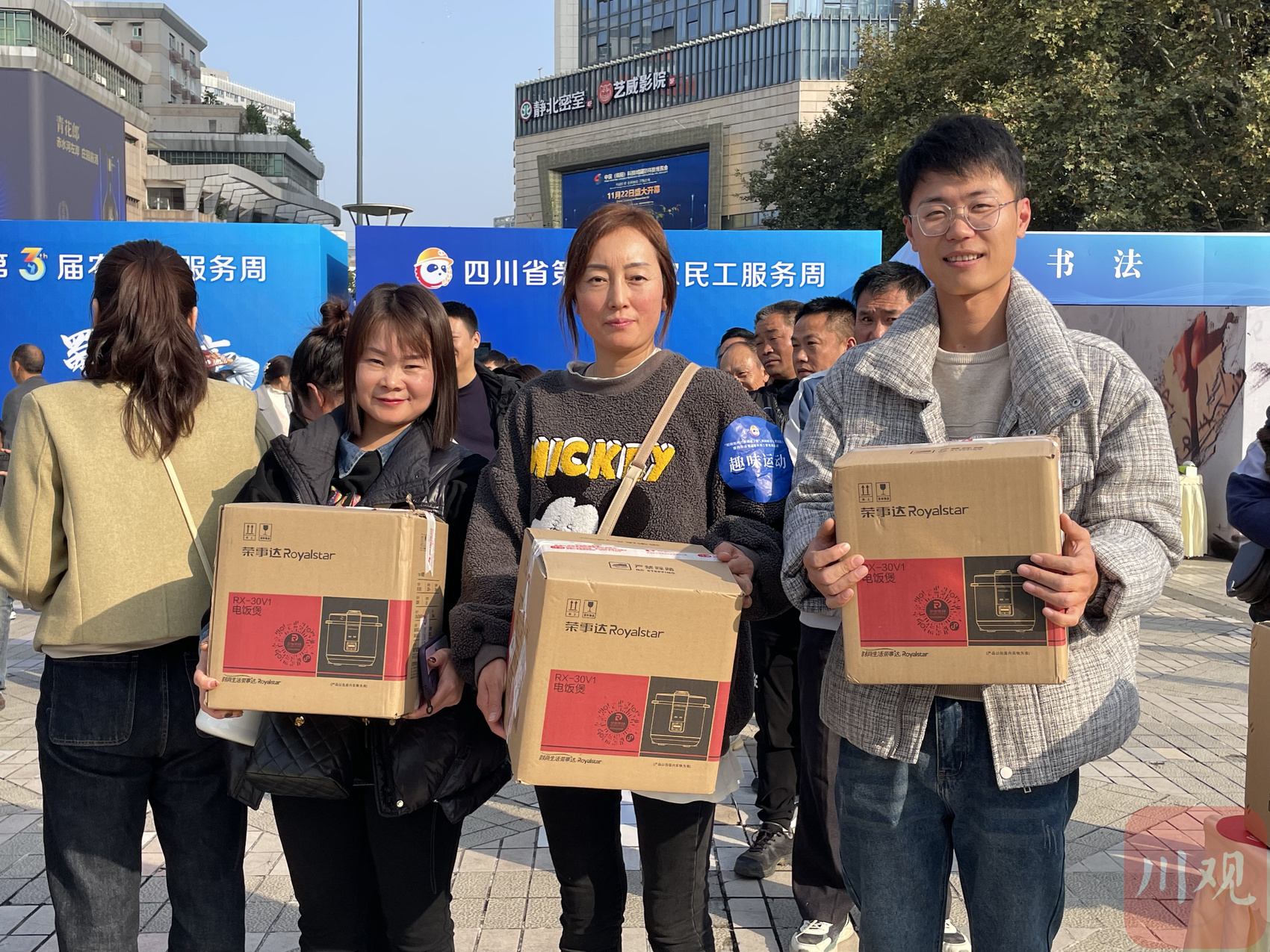 11月17日,四川省第三届农民工服务周活动在四川绵阳圆满闭幕。活动期间,累计为农民工提供招聘岗位8900余个,达成就业意向2600余人;展出返乡创业成果商品1500余件;维权、创业、慰问演出等各服务专区累计服务农民工30000余人次……