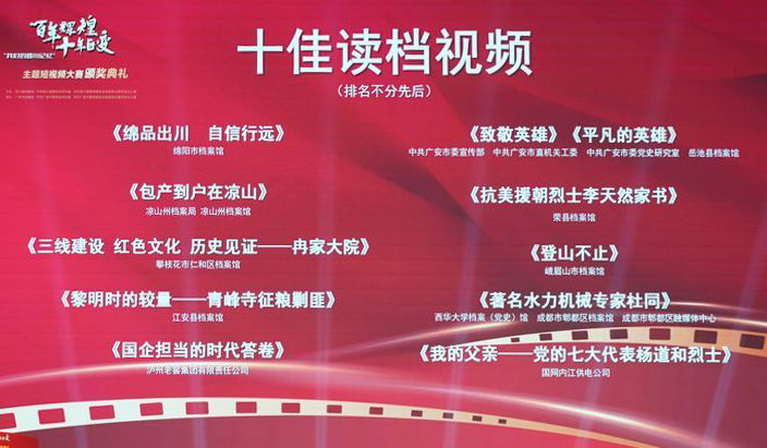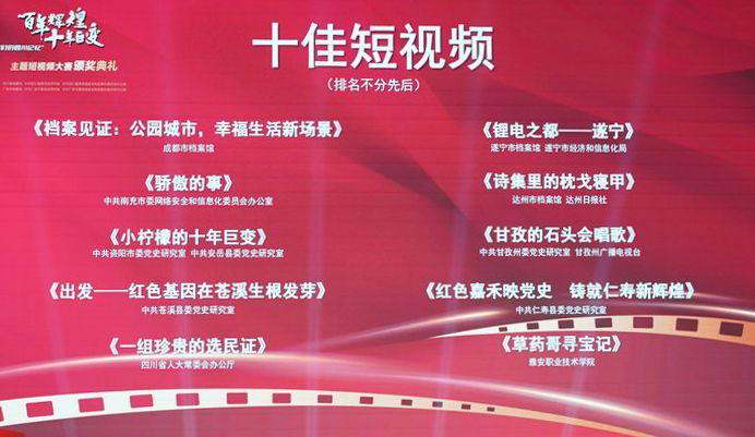 11月22日,“百年辉煌·十年巨变”——“我们的四川记忆”主题短视频大赛颁奖典礼在广安市举行。成都市档案馆《档案见证:公园城市,幸福生活新场景》等10部作品斩获“十佳短视频”,绵阳市档案馆《绵品出川 自信行远》等10部作品荣获“十佳读档视频”。
