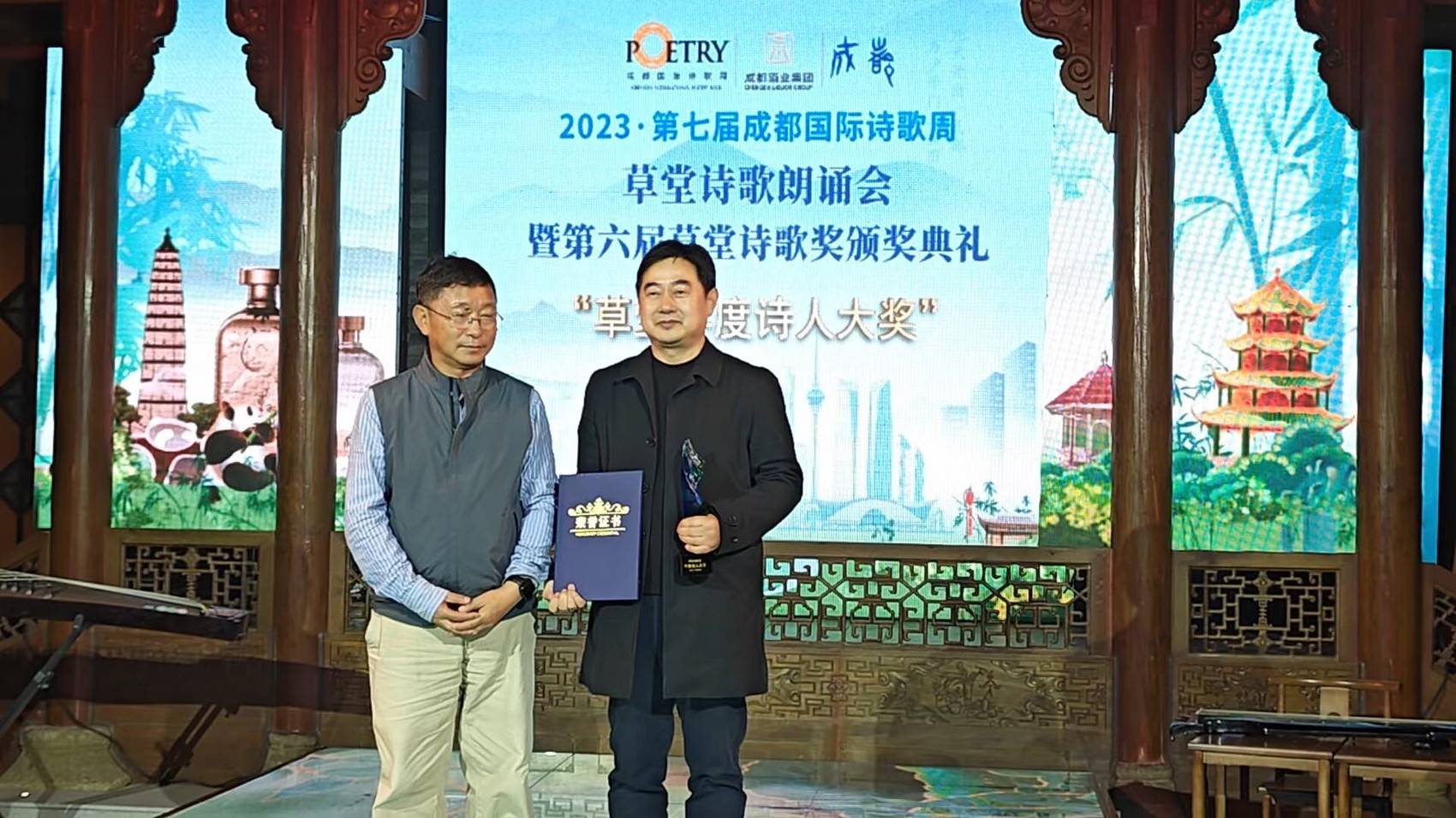 11月22日晚,2023·第七届成都国际诗歌周——燃烧的诗歌成都诗酒之夜暨第六届草堂诗歌奖颁奖典礼在成都邛崃举行。中外诗人齐聚一堂,共同见证诗坛盛典,并举杯畅聊诗酒人生。