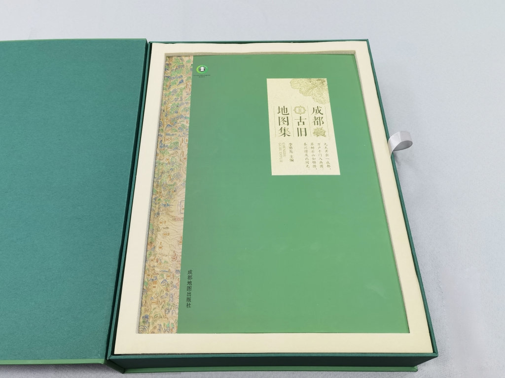 “厚重”,大概是所有人见到这本《成都古旧地图集》的第一印象。聚光灯下,从中间部分摊平,绿色的封面与封底铺开后,几乎覆盖新书发布会发布台的整个桌面,也让现场观众不禁发出惊叹声。