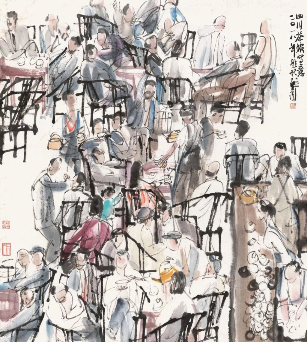 四川茶馆写意(中国画),尺寸:122cm×110cm,戴卫 作