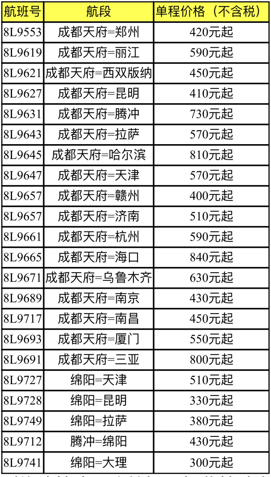 据介绍,祥鹏航空此次推出的特惠航线,覆盖了四川地区飞往全国的22个航点,包括拉萨、乌鲁木齐、哈尔滨、西双版纳、厦门、三亚、昆明等热门目的地。单程价格低至300元,适用航班日期为即日起至2023年12月31日(含)。