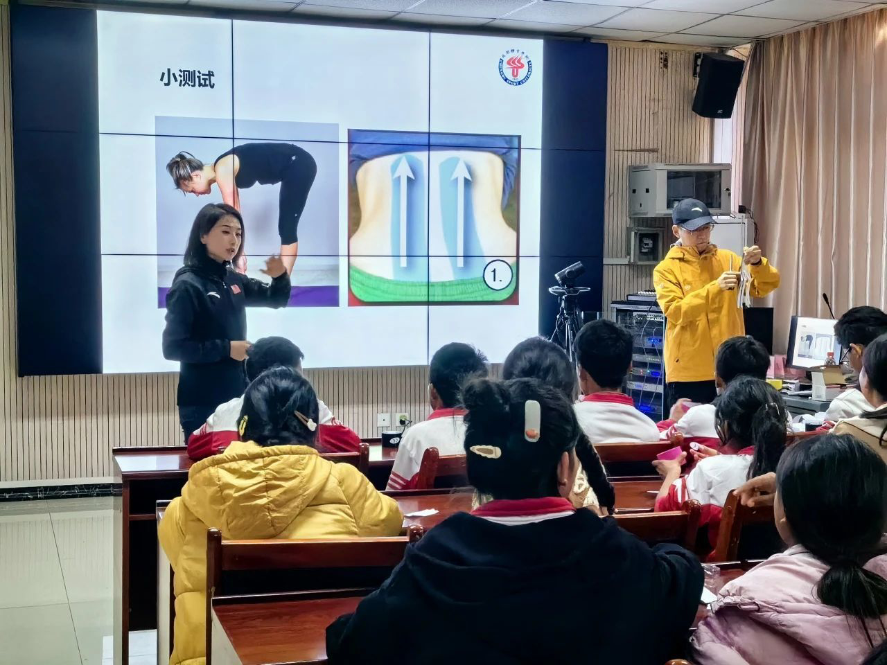 足球场上,专家团队的老师以前沿的训练方法为校足球队进行了一堂高质量的体能训练课,向同学们展示奥运冠军体能训练的精髓。