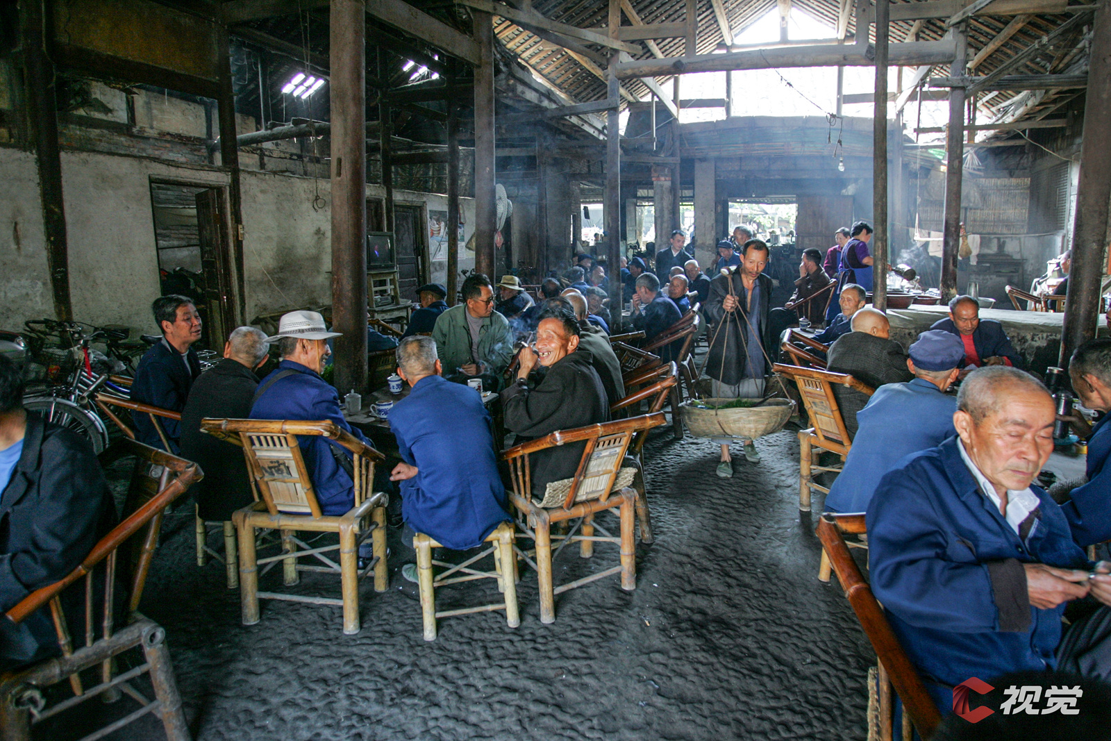 卖菜的挑着担子穿过观音阁老茶馆。