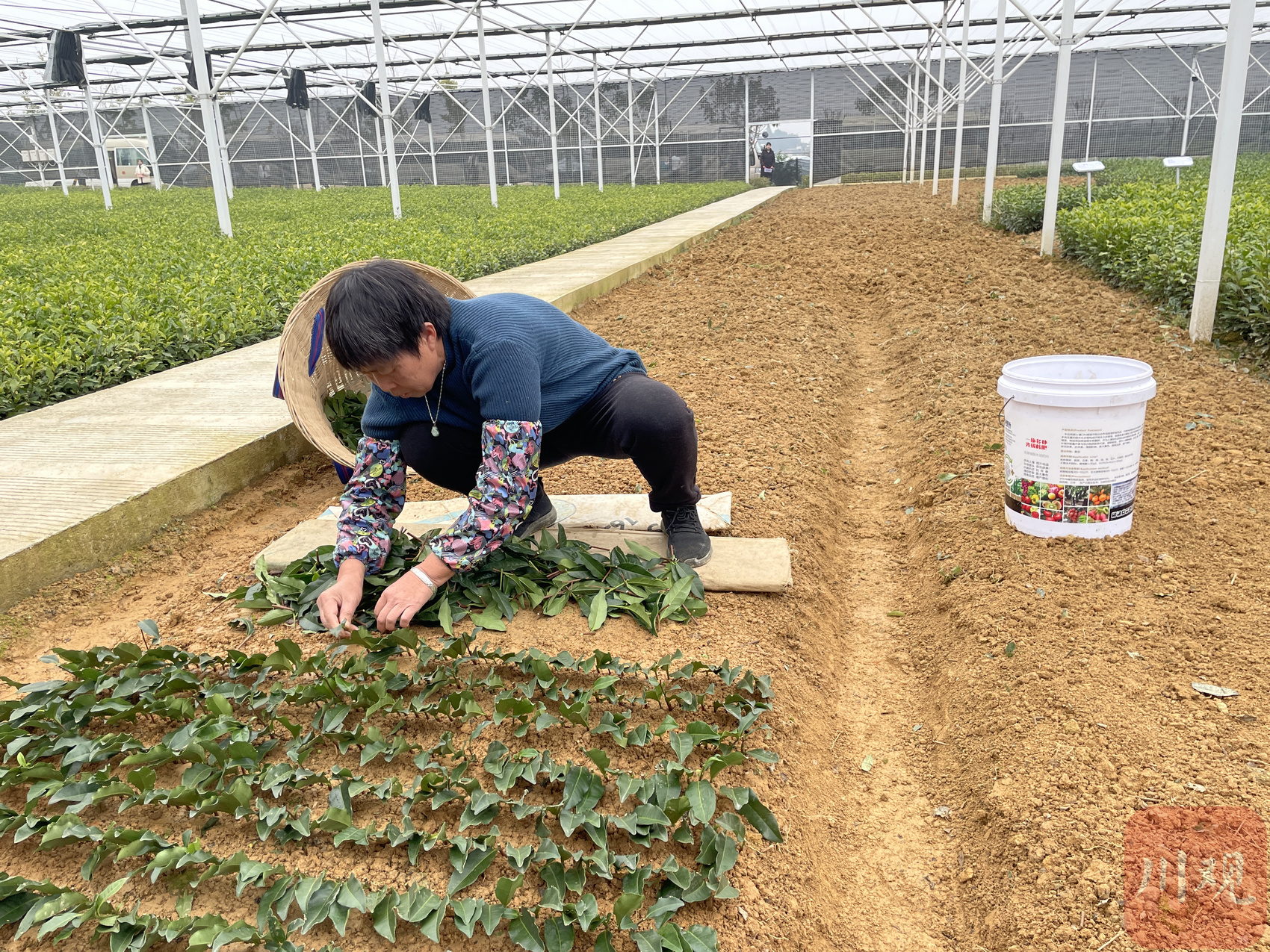 11月24日,雅安市名山区茅河镇香水村,四川农业大学与雅安市名山区共建的百校联百县兴千村示范基地里,村民王先英正在育苗温室大棚里扦插茶苗穗条,一个一米多的开厢上,横向可以扦插50多个穗条。