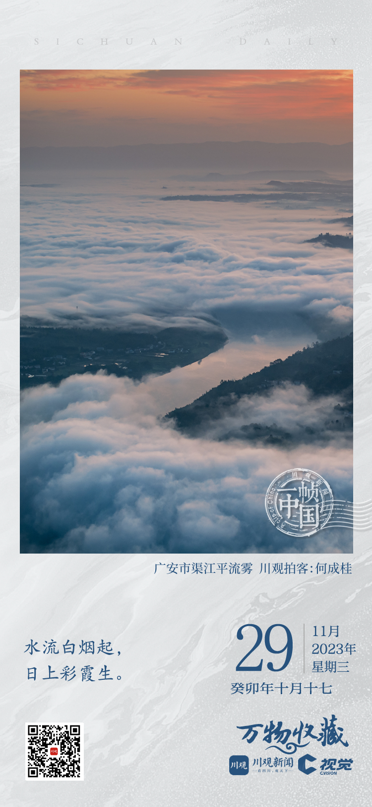 水流白烟起,日上彩霞生。