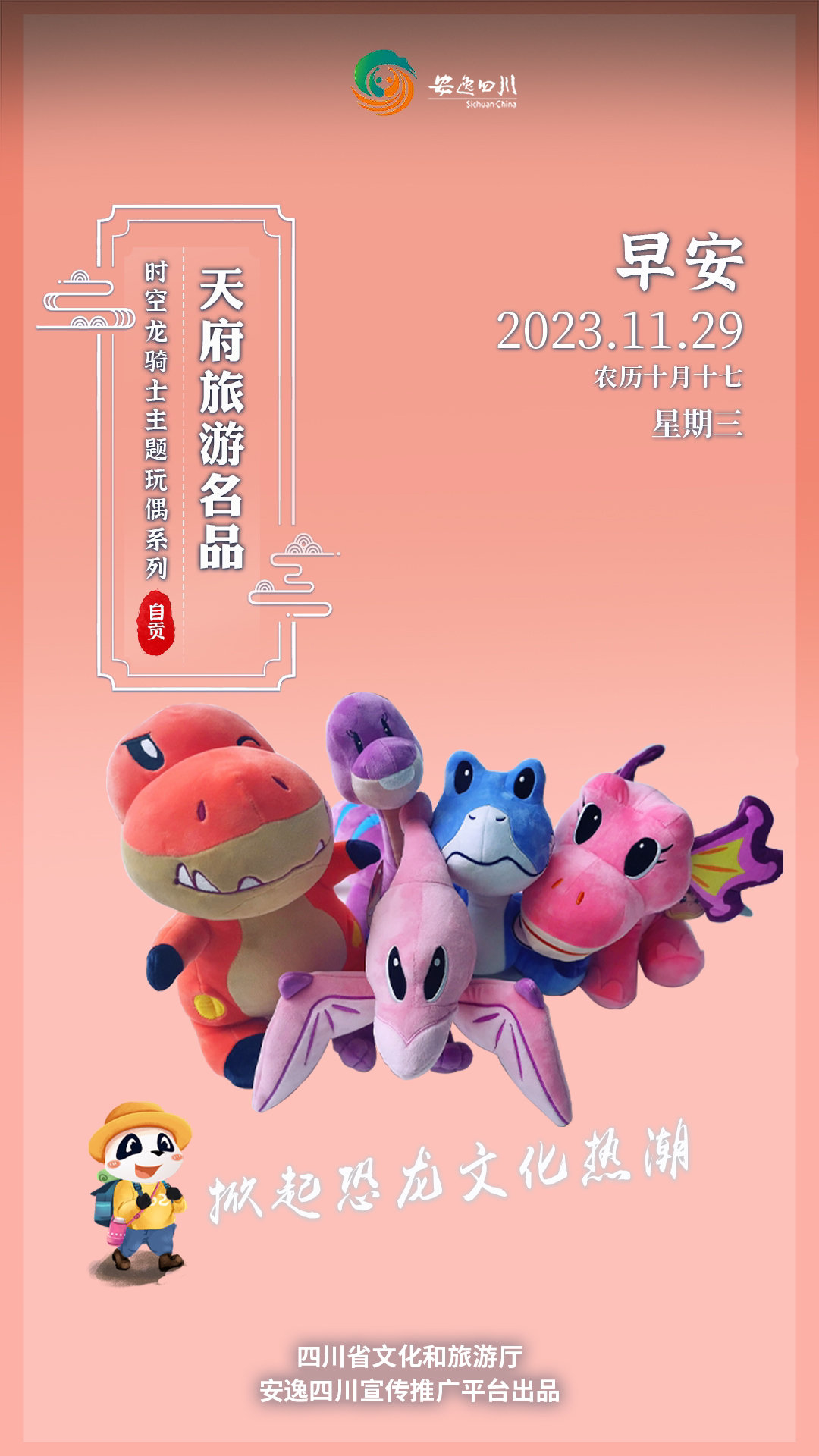 11月29日,星期三。今日安逸四川日历海报“天府旅游名品”之旅走进“时空龙骑士”主题玩偶系列。