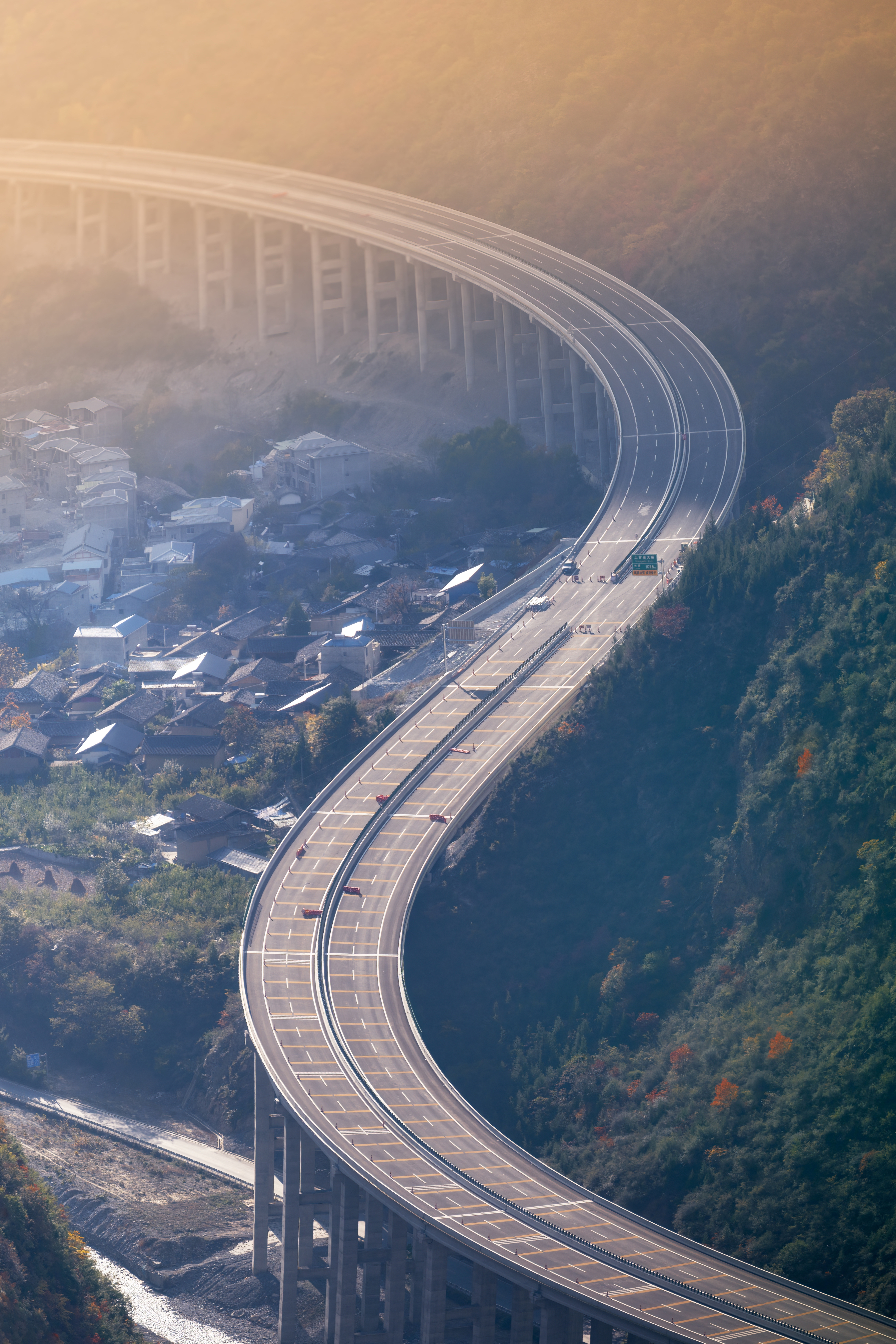 路面铺筑在九绵高速平通段的拱桥村大桥进行。大桥为双向四车道,路面为双幅,一侧路面正在进行沥青铺筑。远远地,就看到几台压路机来回压路,机器声轰鸣。