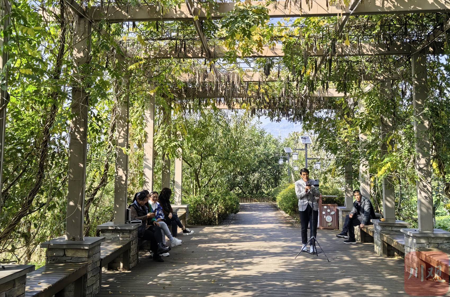 村民、游客在三强村果园休息。 王若晔 摄