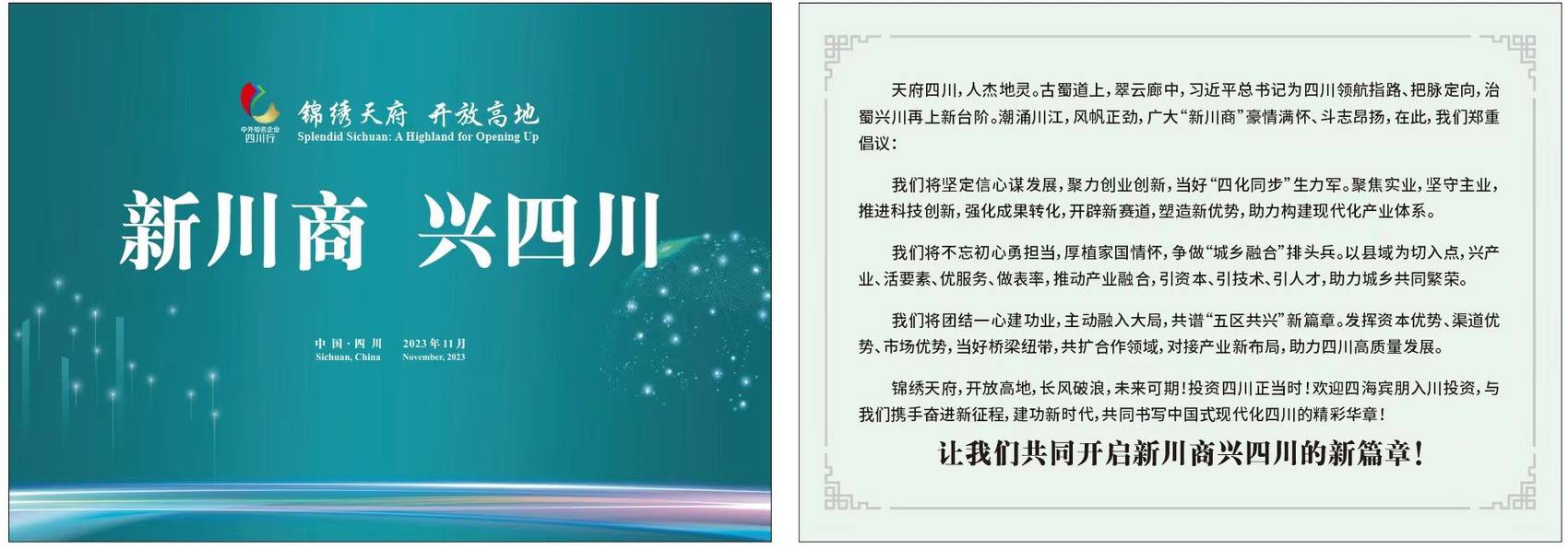 11月30日上午,2023中外知名企业四川行投资推介会暨项目合作协议签署仪式在蓉举行。现场,11位四川异地商会会长代表外来民营企业,联合发出《新川商·兴四川》倡议,号召中外知名企业投资四川、扎根四川、建设四川。