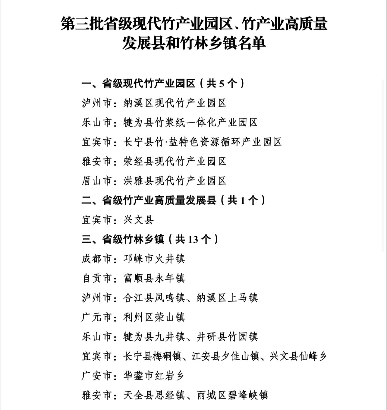 此次授牌的,有第三批省级现代竹产业园区5个,省级竹产业高质量发展县1个,省级竹林乡镇13个;第四批省级竹产业高质量发展县1个,省级五星级现代竹产业园区2个,省级四星级现代竹产业园区3个。