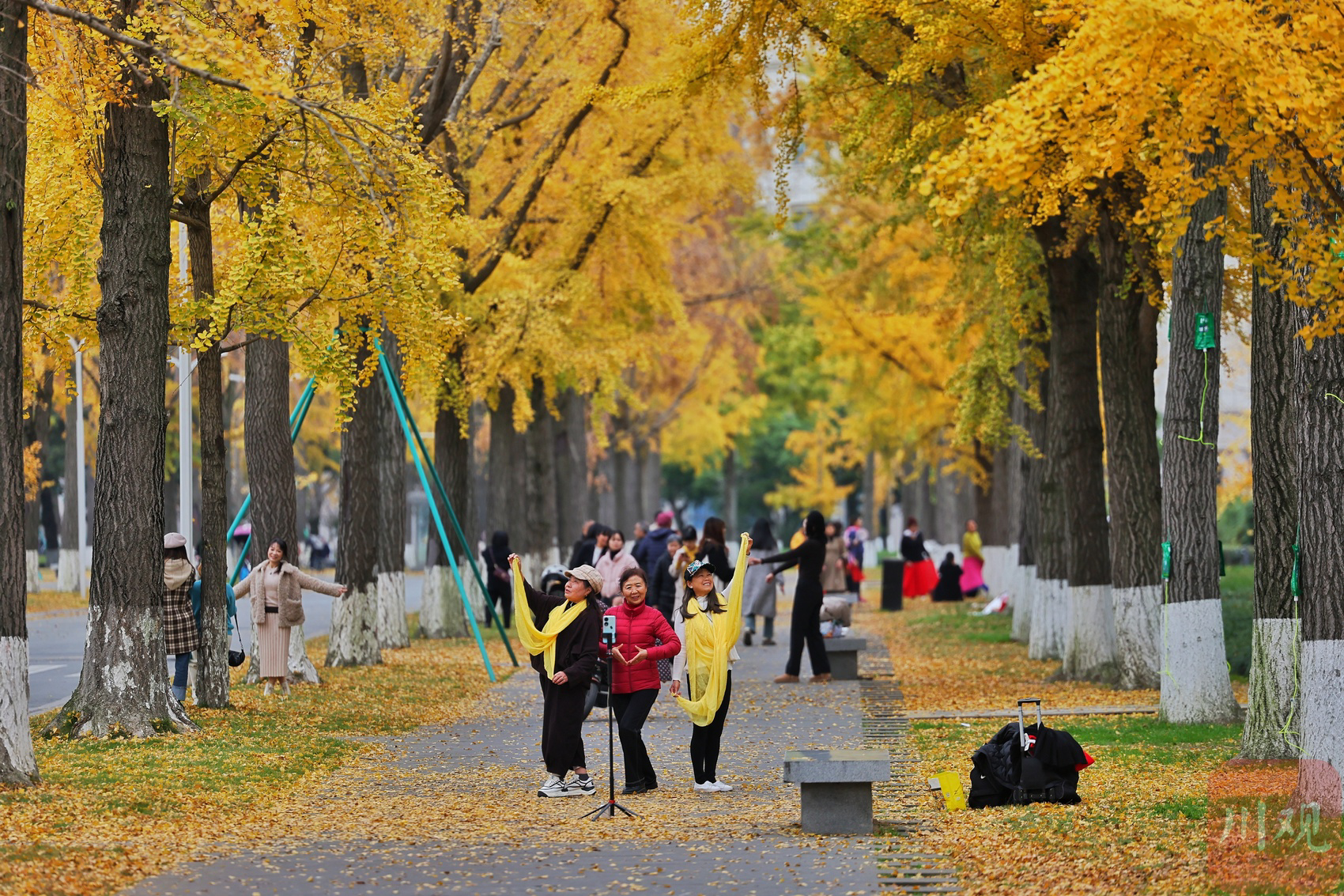 11月30日,天气晴朗,电子科技大学清水河校园里的银杏大道披上了一层金色的外衣,专程到校拍照打卡的市民络绎不绝。
