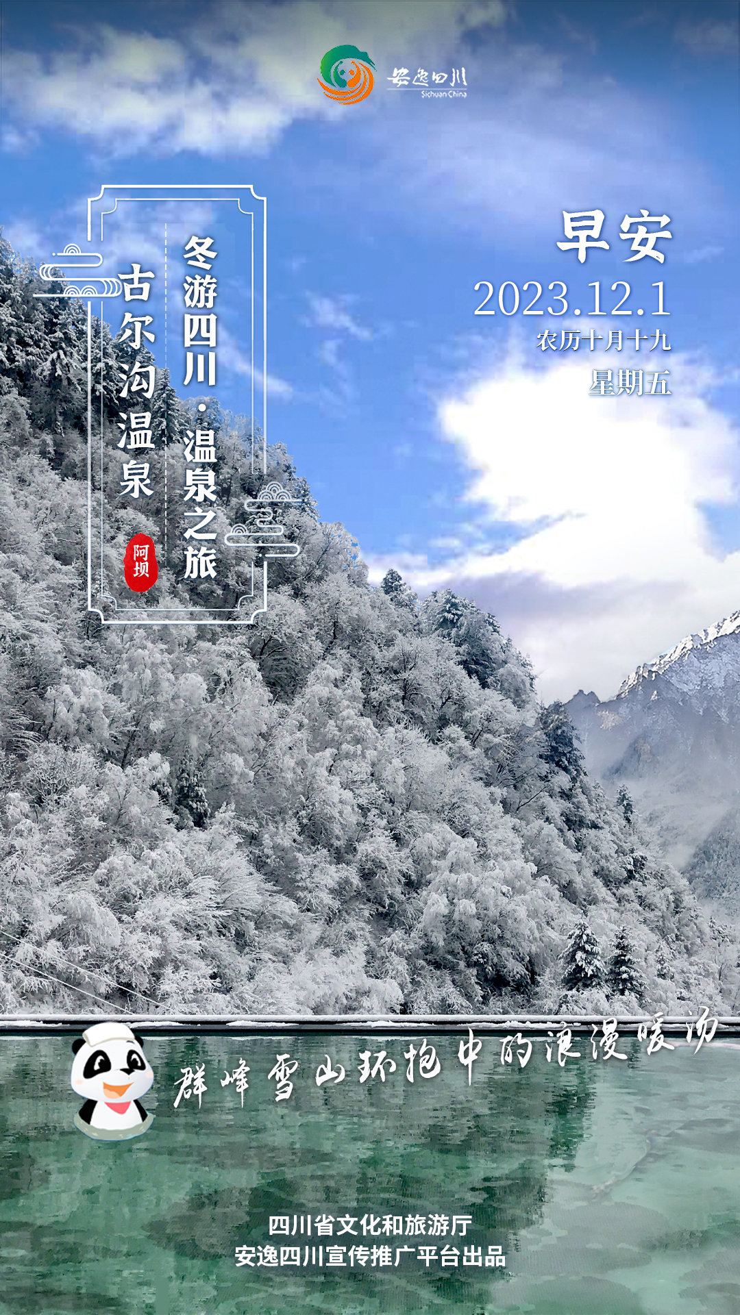 12月1日,星期五。今日安逸四川日历海报开启“冬游四川”之旅,走进古尔沟温泉,感受雪山环抱中的自然暖意。