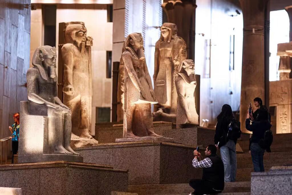 11月30日,人们在埃及吉萨的大埃及博物馆参观“大楼梯”走廊上的雕像。