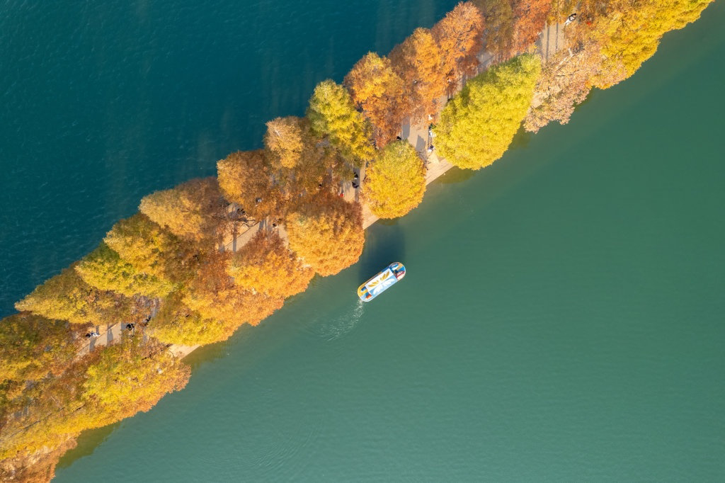 近日,湖南省长沙市烈士公园的水杉树叶渐露金黄,景色如画,吸引市民前来游玩打卡。