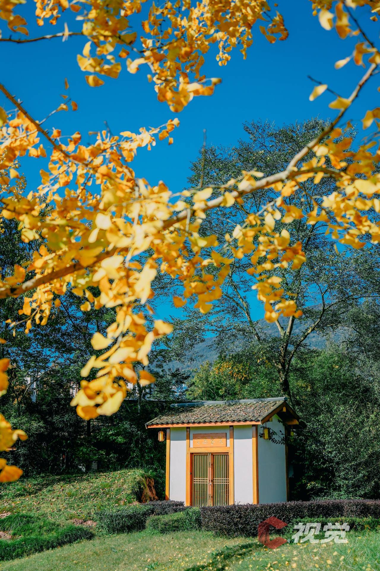 雅安蒙顶山下,金色的银杏开得正好,与蓝天下的古建筑相映成趣,别有一番韵味。