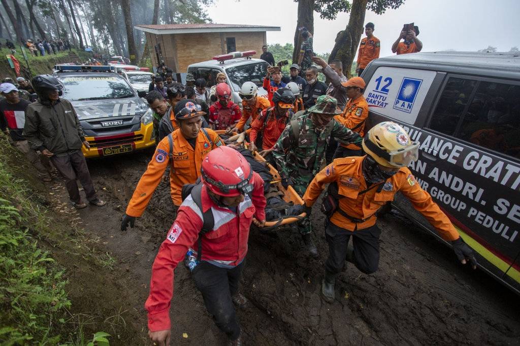 12月4日,在印度尼西亚西苏门答腊省的马拉皮火山附近,搜救人员转移伤者。