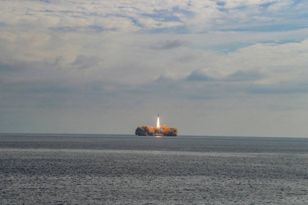 这是韩国国防部12月4日发布的火箭在济州岛附近海域的一艘驳船上发射的照片。