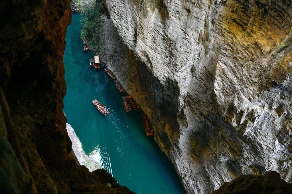 12月4日,游客在鹤峰县容美镇屏山峡谷乘船观光。