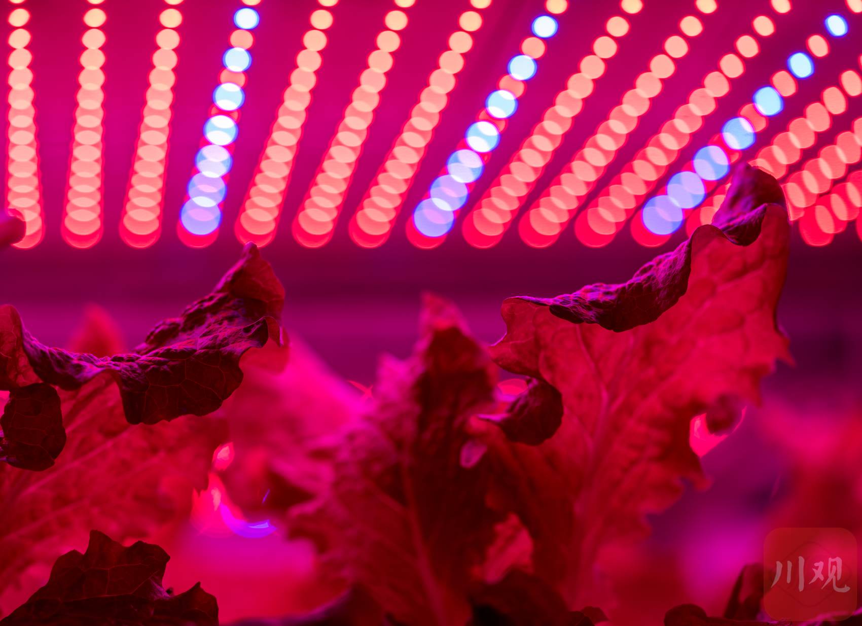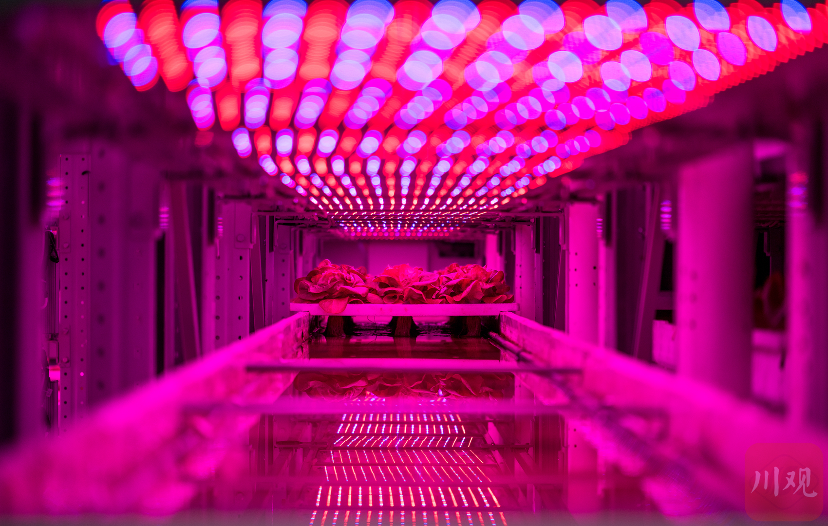 12月4日,在天府新区的成都国家现代农业产业科技创新中心, 一盘盘定植好的生菜苗,正在被全自动传送带运到一排排钢架上的预定位置,生菜苗的上方布满了密密麻麻的LED光源,它们将在这个巨大的植物工厂里开启为期一个月左右的“生长期”。