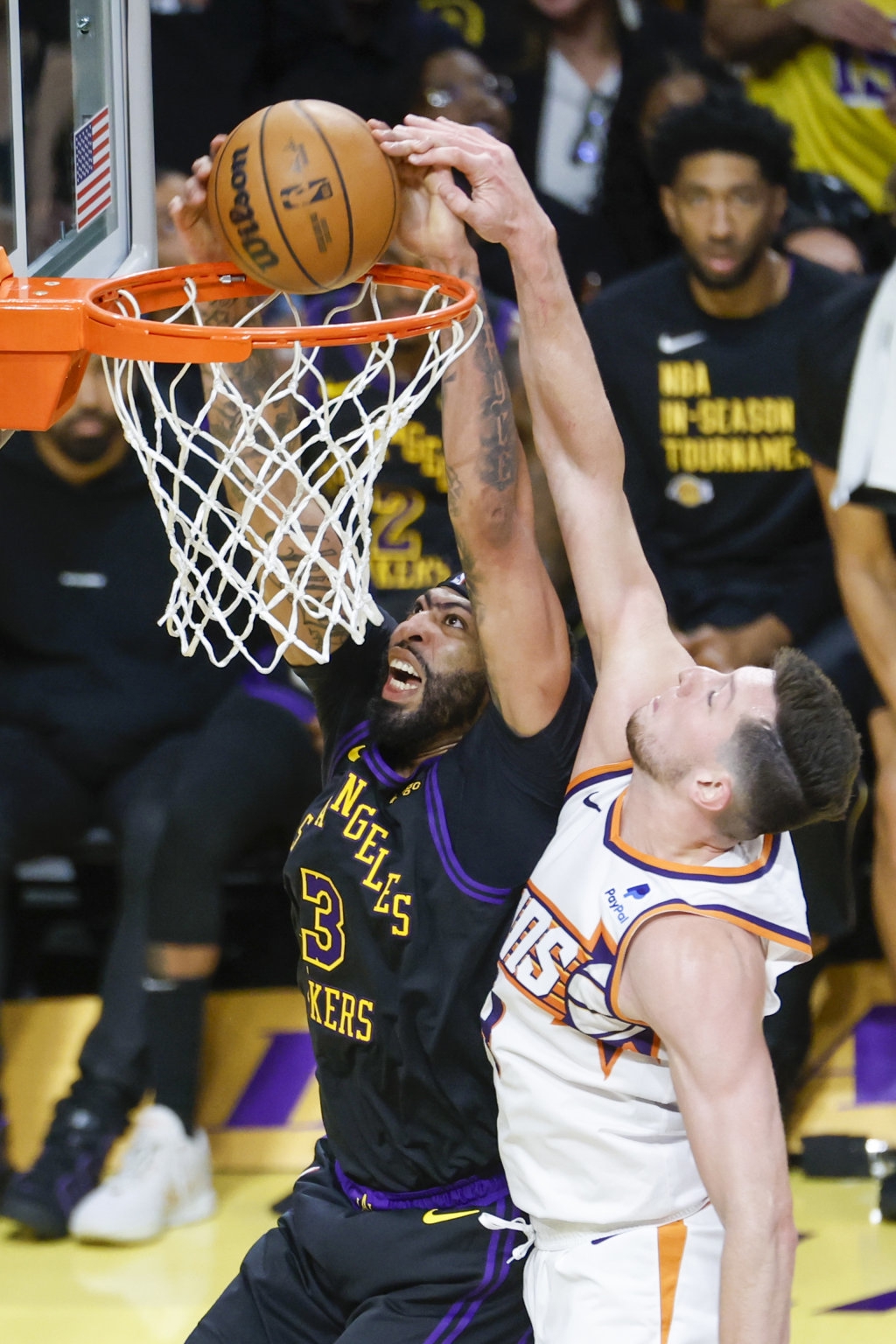 12月5日,湖人队球员安东尼·戴维斯(左)在比赛中扣篮得分。