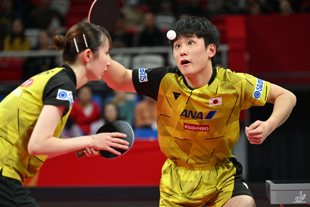 12月6日,日本队选手张本智和(右)/早田希娜在混双比赛中发球。他们以3比0战胜中国台北队选手陈映蓁/王晨又。