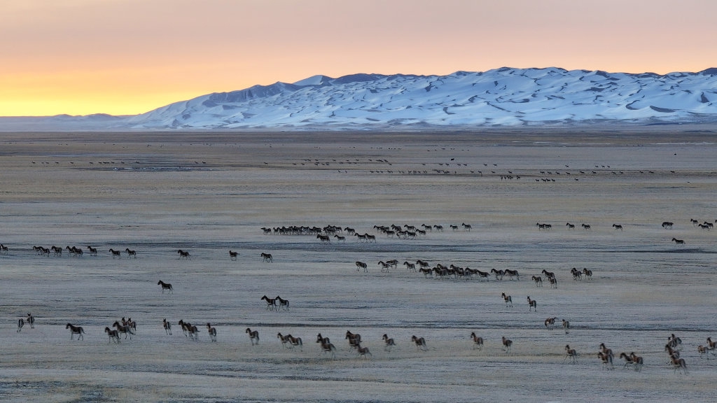 2023年10月17日,在新疆阿尔金山国家级自然保护区,藏野驴在晨光中奔跑(无人机照片)。