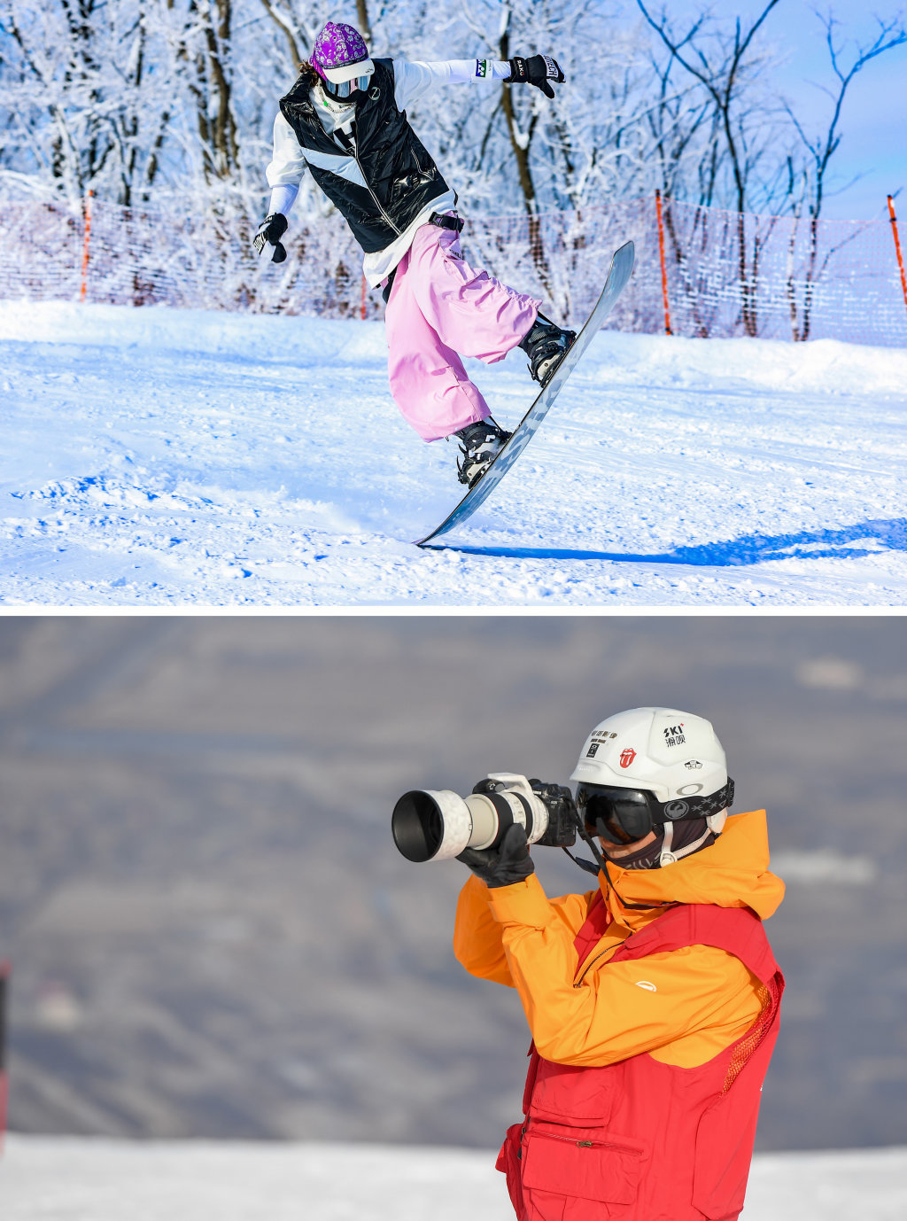 上图:雪场摄影师张健拍摄的雪友滑雪照片(2021年11月23日摄);下图:12月7日,在吉林省吉林市万科松花湖度假区,雪场摄影师张健在工作中。